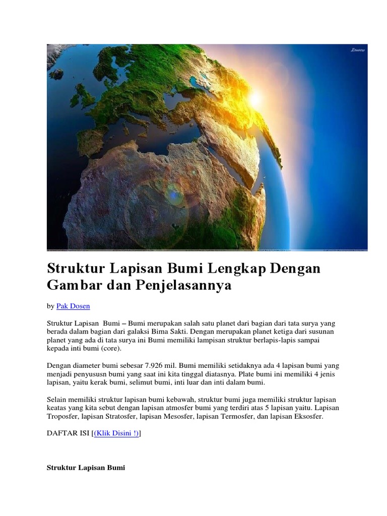 Bumi memiliki setidaknya ada 4 lapisan bumi yang menjadi penyususn bumi yang saat ini kita tinggal. Diajukan untuk memenuhi tugas terstruktur. Ada juga perkataan sinonim dan berkaitan dengannya ada dipaparkan di sini. Melindungi permukaan bumi dari pancaran sinaran uv. Zon batu dan tanah yang membekalkan tanih,mineral dan batuan.